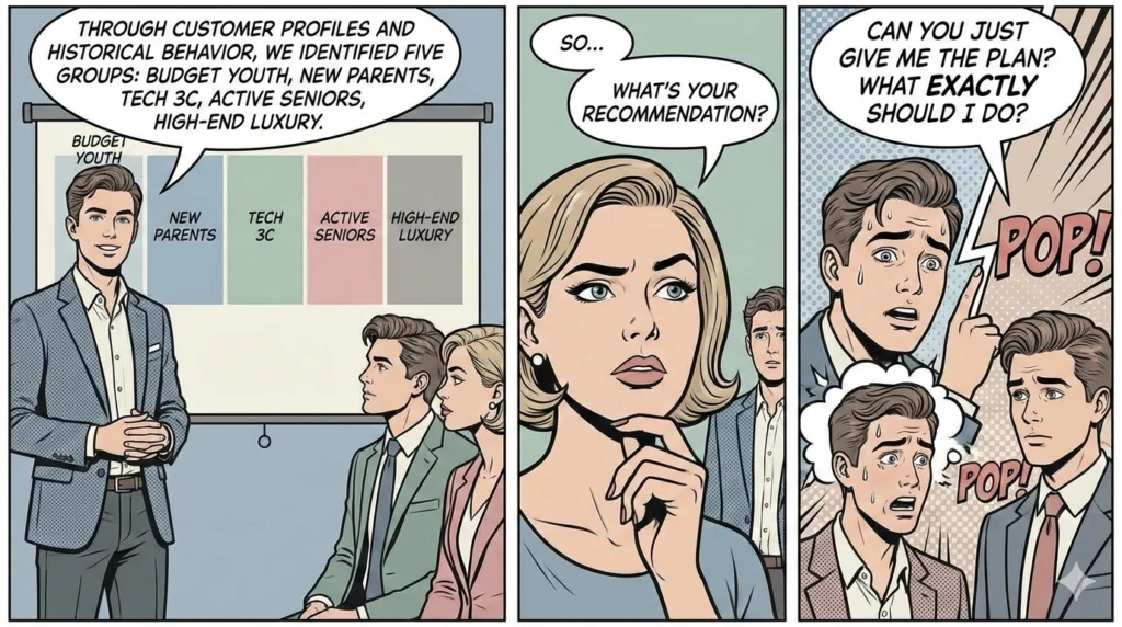 某日週五下午三點,會議室裡坐著一位數據分析師Jason,跟Jason的主管Adam,還有產品PM Doris。Jason花了兩週時間做客戶分群分析,準備了20頁精美的PPT。他講得很流暢,從背景、痛點、分析方法到結果,每個環節都很完整。